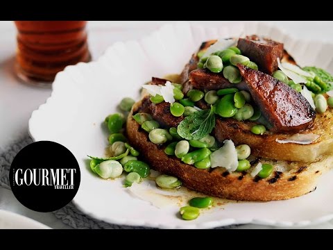 Chorizo, broad beans and Manchego | Gourmet Traveller - Broad Bean Chorizo - Gourmet Traveller cooking video for chorizo, broad beans and Manchego. Subscribe to our channel here: http://goo.gl/3KThGh Get the recipe here: ...